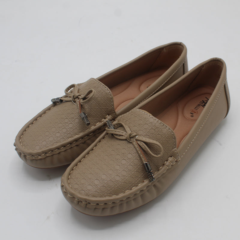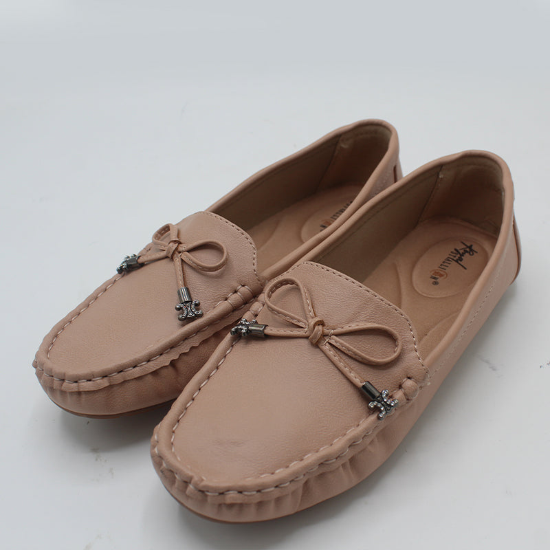 The upper is crafted from a soft, pliable light nude/blush leather-look material, providing a smooth, flexible fit. The design features traditional moccasin construction with hand-stitched detailing around the rounded toe. The focal point is the decorative leather bow detail on the vamp, finished with elegant silver-toned metal charms at the tips. This is a comfortable slip-on flat designed with a flexible sole, ensuring excellent wearability and freedom of movement, characteristic of driving shoe styles.