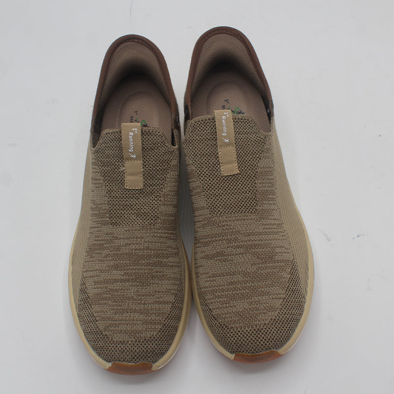 The shoe features a modern, laceless slip-on design with an upper crafted from a multi-textured brown/taupe knit material. This knit provides zone-specific support and maximum breathability, giving the shoe a refined, sock-like fit. The collar and heel counter feature a contrasting dark brown trim, with a pull tab on the instep. The heel also displays branding related to "Running."