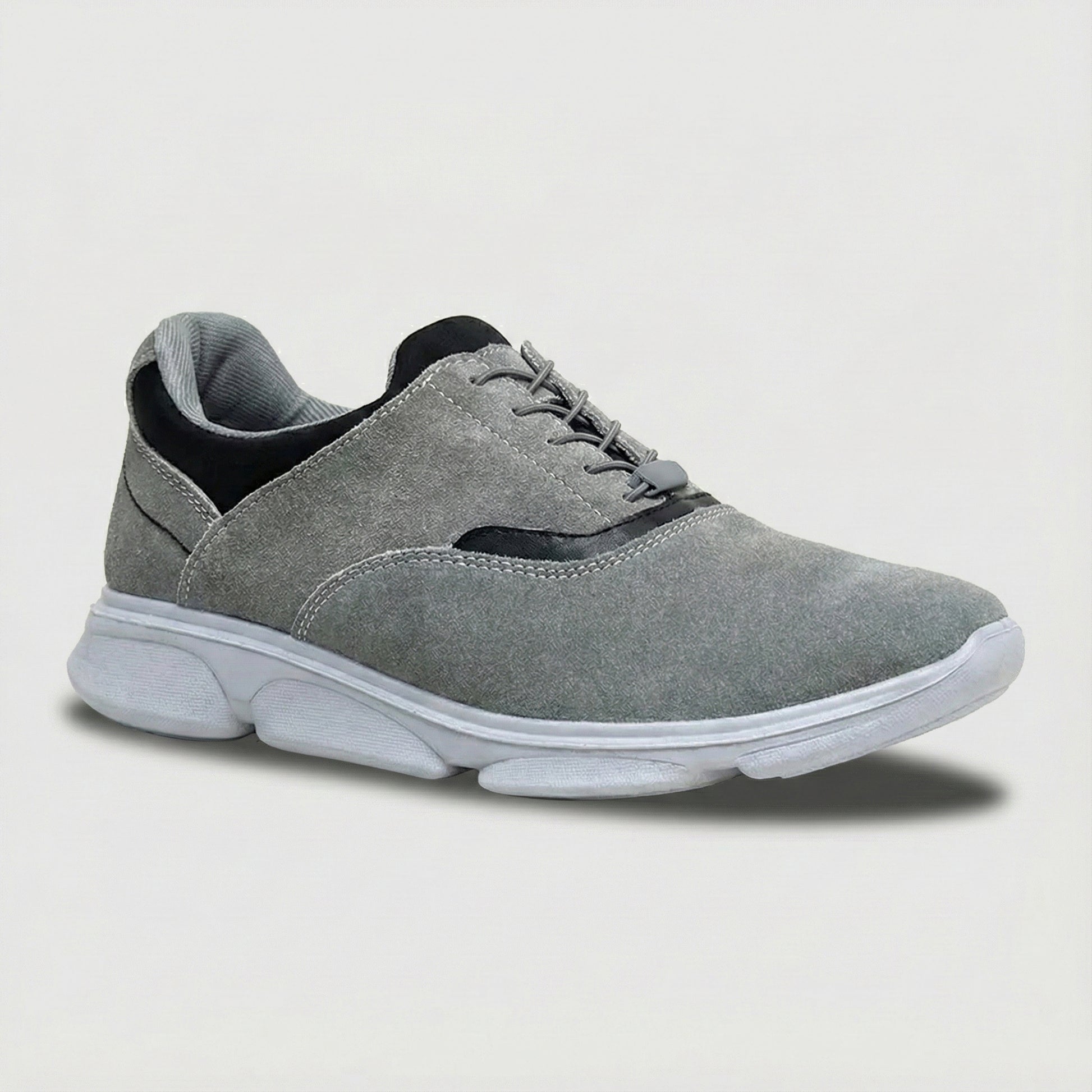 The upper features a rich, deep black suede-like material (often referred to as micro-suede), offering a refined texture and durable wear. This dark foundation is elegantly framed by light grey textile accents surrounding the heel collar and trimming the lace area, adding a dynamic, contemporary contrast. The design leans into a clean, minimal look with subtle lacing for aesthetic effect and an overall slip-on functionality for effortless on-and-off.